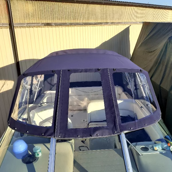 På denne båten på bildene var kalesjen laget av Dorcril N-stoff i fargen Marineblå (084).