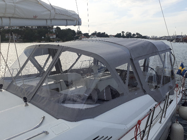 Det blåa kapellet är en fransk original sprayhood till Beneteau Oceanis 46.1. Sprayhood med tillhörande sittbrunnskapell i grått är CAD designat och tillverkat av Seaside Marin.